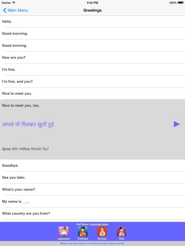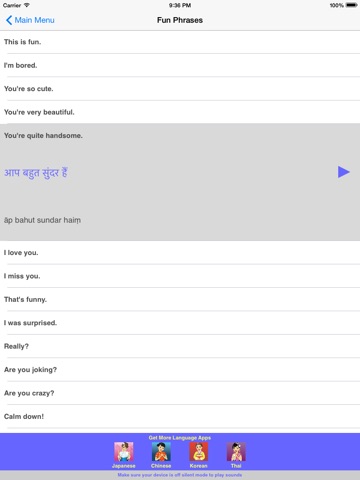 I really like this Hindi app for the iPhone! Ive been trying to learn Hindi and this is very helpful and easy to use. The Hindi speakers sound very nice. Its definitely helping me learn Hindi. I also love the fun phrases.