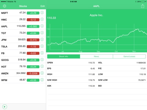 * Hear all the the latest stock info for your stocks which includes, stock quotes, news, and gains/losses.