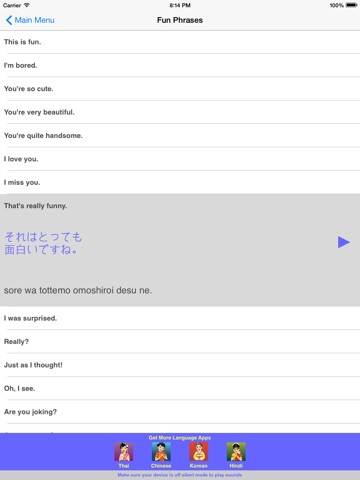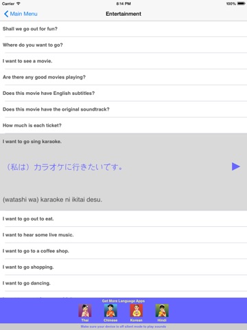 Great for travel or study! Speak Japanese Travel Phrasebook is an easy to use talking phrasebook app for the Japanese language. Each phrase is displayed in large sized Japanese script, phonetic transliteration, and English translation. Hear the audio for each phrase in a clear, pleasant voice from a native Japanese speaker. There are over 500 words and phrases in the following categories: