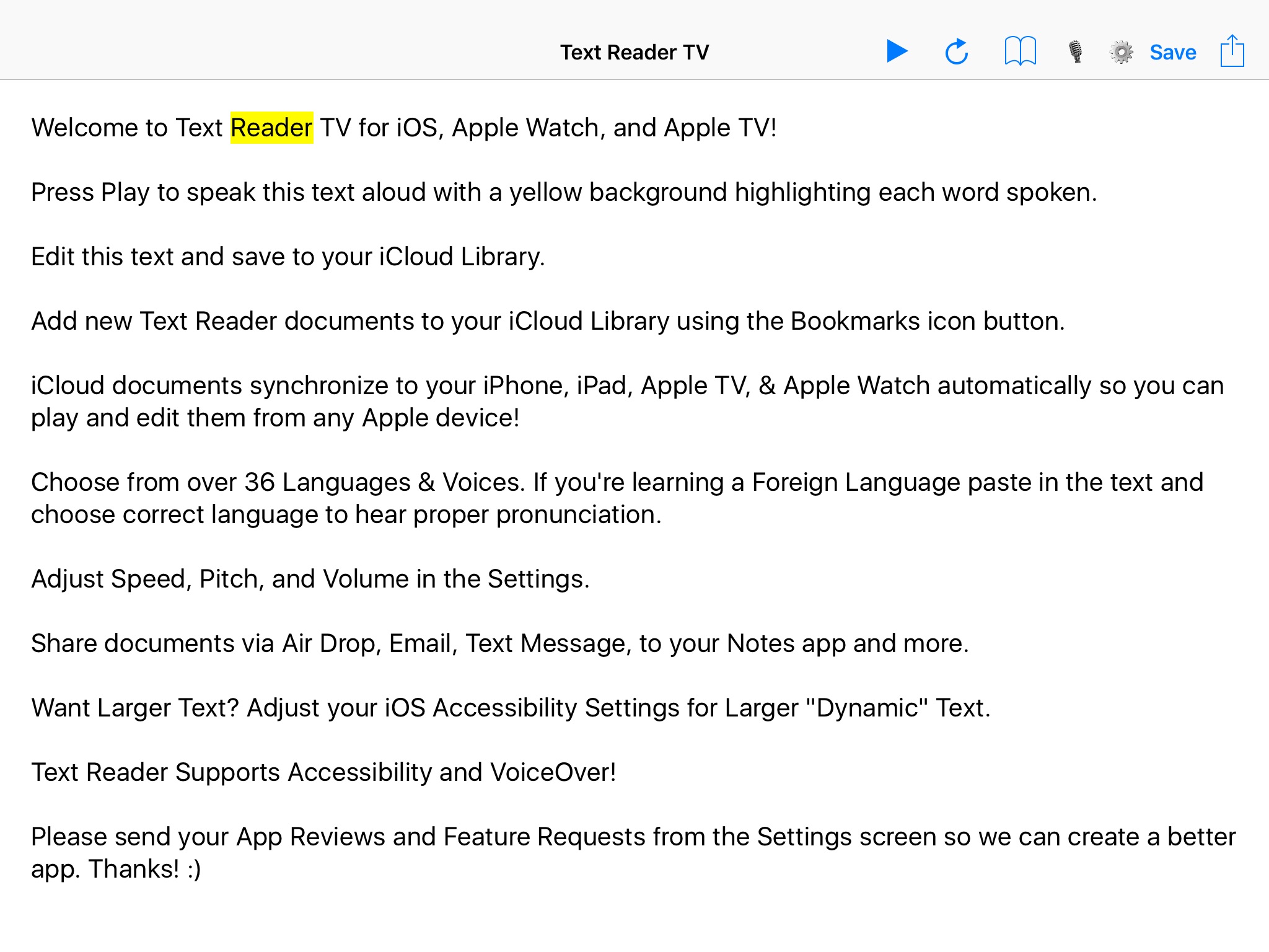 36 Languages Spoken Out Loud by Your iPhone & iPad! New for iOS 9! Visual highlighting of current word spoken! Speech keeps talking in the background while using other apps! Hear foreign language translations spoken with the correct pronunciation. Text scrolls to follow yellow highlight of current word spoken. Adjust Speed, Pitch, and Volume in the Settings.