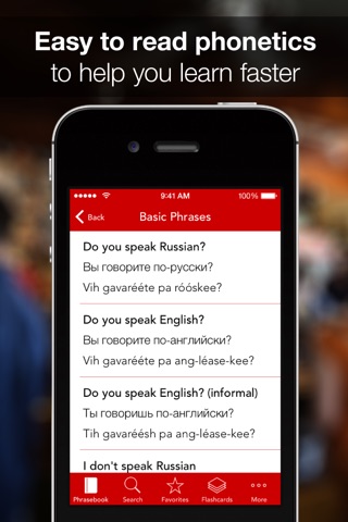 Written specifically for English-speakers, this Russian phrasebook leaves no room for mispronunciation. Each phrase includes a translation to Russian, an easy-to-read phonetic translation, and an audio recording of a native Russian speaker - all contained in a well structured, user-friendly interface.