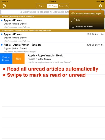 - Add favorite articles with "Starred" to speak aloud later