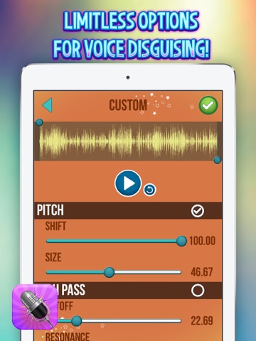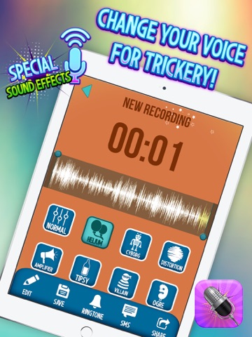 Create unbelievable voice distorsions in a second! Special Sound Effects with Voice Changer SFX for Speech and Recordings Editing let your imagination run wild as you choose incredible transformations for your voice. This is the perfect way to play tricks on your friends and get them completely confused!