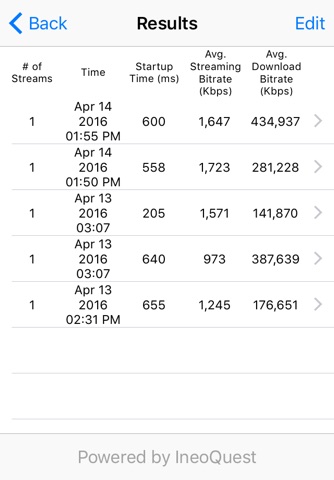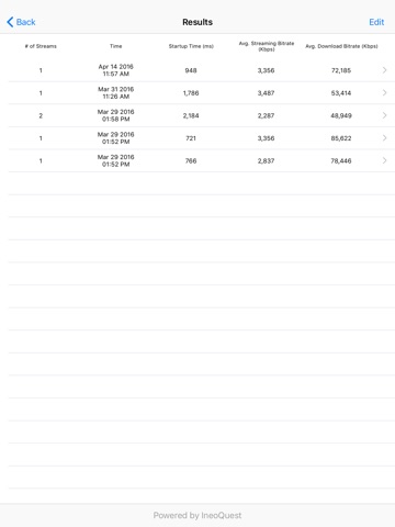 · Summary information for each stream test including streaming quality assessment