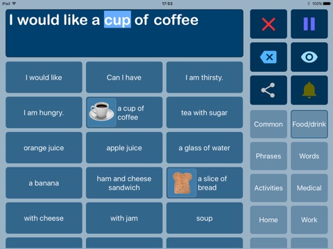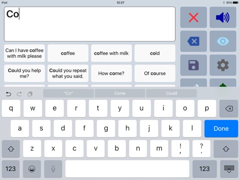 With the app you can create categories and save phrases on buttons for quick access and easy communication. You can also type messages using the iOS keyboard.