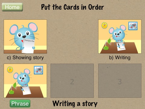 Build basic sequencing skills by ordering three cards showing Milo and Melvin performing a task. For example, cards showing Milo “Washing Hands” and “Going to the Movies” are presented in random order. The child is tasked with putting the cards in order by dragging the images into the appropriate box (numbered 1-3). Once the child has put the cards in order, they are provided with the option to play the animation demonstrating the sequence of events. The app is provided with configurable options to view hints, hear the sentence aloud, ‘success’ sounds, etc. Forget those $15 Sequencing cards at the educational stores- this is much more fun for your child.