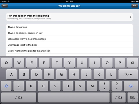 Enter your notes, one card at a time, then edit and re-arrange to your hearts content. When youre ready, have the speech played back to you as prompt cards, one card at a time.