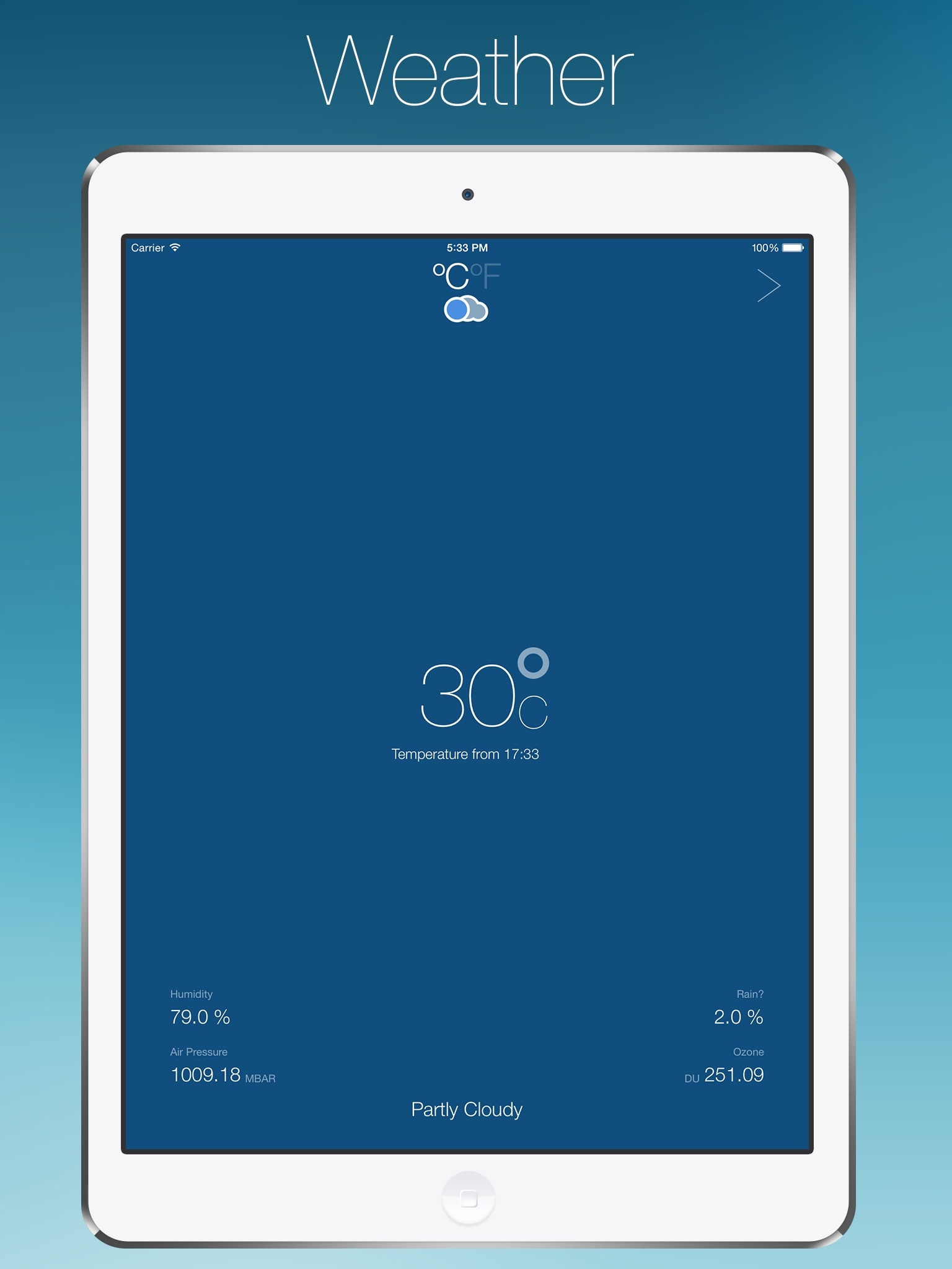 • The Weather Section gives all relevant weather data for the current location such as temperature (ºC or ºF), air pressure, humidity, precipitation, ozone and a resume description with an weather icon depend on the conditions.
