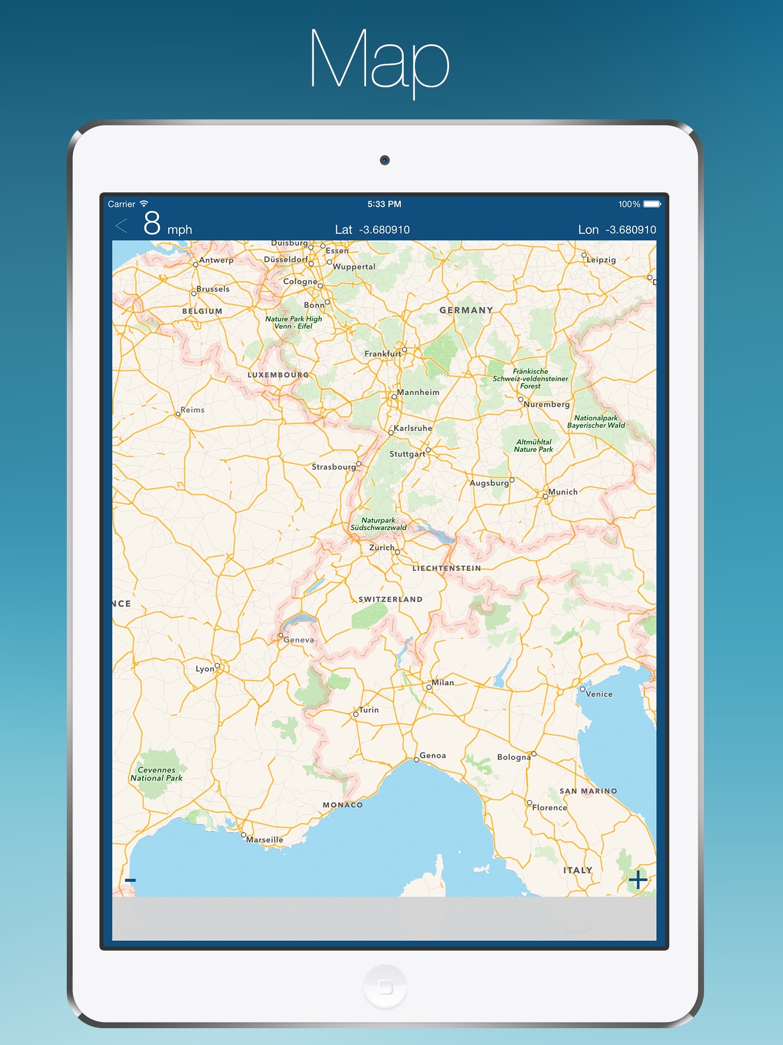 • It features also a map that keeps track of the journey. It “prints” or renders a line of the trip. You can zoom in and out of the map or change the units of the speedo.