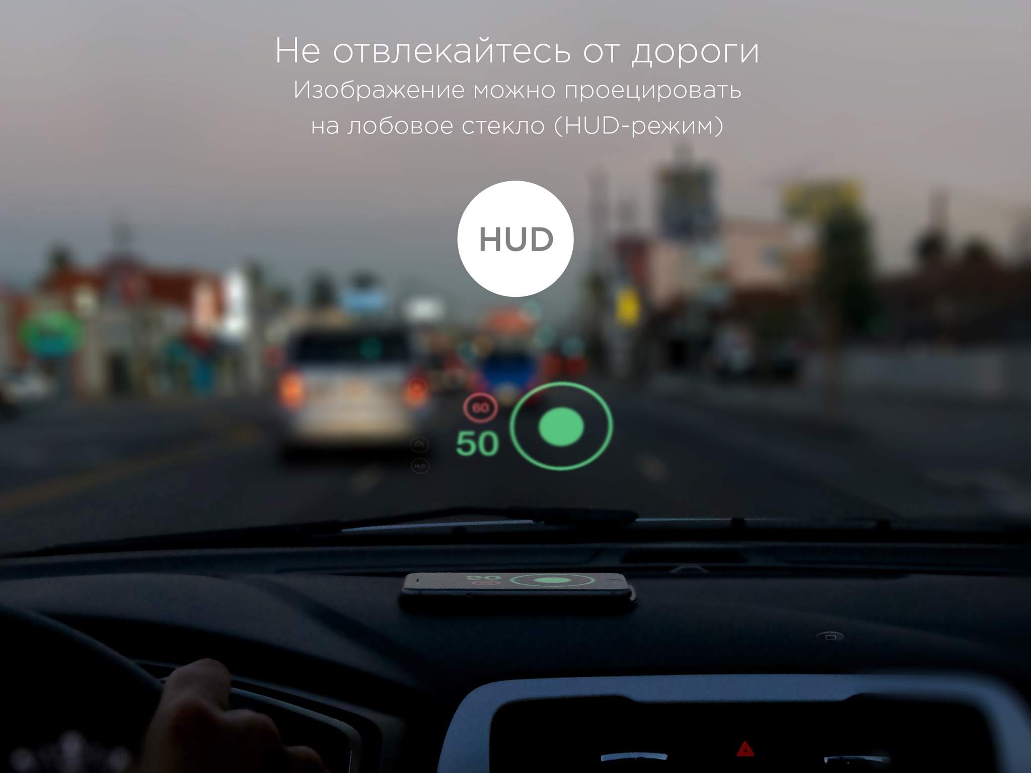 The app is straight and handy, with no tricky settings. Launch the app and place the phone onto the dashboard close to the windshield (if you want to use it in Head-Up Display or HUD mode and see the reflection on the windshield), or into the mount (for standard use). Its specifically designed to offer you a safe and non-distracting visual assistance.