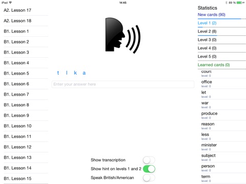 Although the app only teaches British spelling, you can select either a British or an American voice that will speak the words for you.