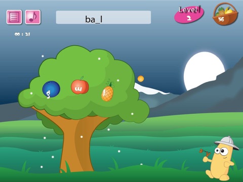 Spell Hunter game consists of various levels of words, with increasing difficulty as the game progresses. Words with missing letters are displayed. Identify the missing letter. Aim the sling and strike at the fruit having that letter(s). Words become increasingly difficult as the game progresses. There is time limit for each level of the game. Smarter one plays, better the score.