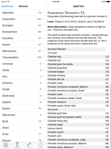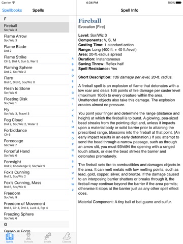 Spells are broken into Spells, Schools, Levels, and Classes, which is helpful. Choosing between d20 or Pathfinder spellbooks is also helpful. The search is fast and the search results show classes and levels for the spell. Is it worth $7 more than Spells 2.08? As a new player, I dont think so.