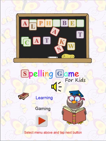 Game application for kid preschool to learn how to spell basic wording of animals, fruits, colors, and numbers with pronunciation, cartoon animation, sound effect, and scoring.