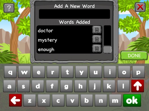 First you enter the words to learn. Unlike other apps that are limited to a set of fixed words, with Spellosaur you enter the words you want to learn - this can be your weekly spelling list, or just a set of words that you have been struggling to learn.