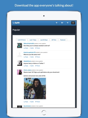 Set a question and watch answers roll in from both members of Spillit and your friends in real life. Find out who has a crush on you, your secret admirers and what people really think about you.