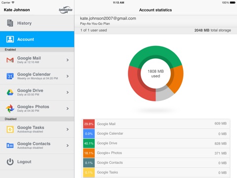- Account Statistics by users, cloud storage, Google apps.