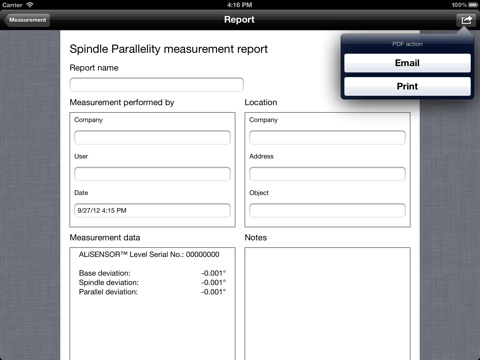 PDF reports can be created instantly with all the measurement data including a schematic drawing of the results. The operator can fill out a form with complementary information about the setup such as operator, company name, location and measurement object notes. Photos can be taken with the built-in camera of the iOS device and be included in the report. The report can easily be shared through email, messages or other apps that can handle PDF files.