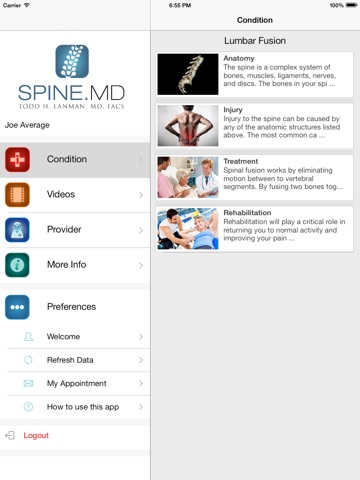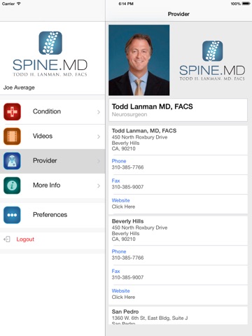 The Spine MD App gives you everything you need to obtain the best result after a spinal injury or surgery, right at your fingertips. With an easy-to-navigate interface and high definition videos you can now take your condition specific information with you wherever you go. Available to registered patients of Dr. Todd Lanman. Email any questions to [email protected]