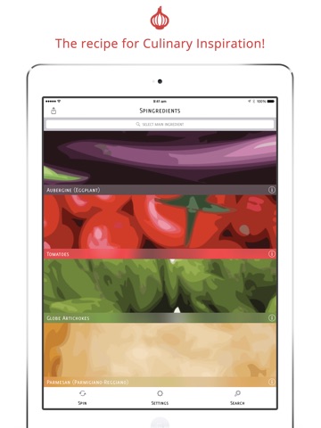 Plan your meal around a staple, shake or swipe to start the spinner, and Spingredients serves up a clean, colorful display of the four basic ingredients you need to create your dish."