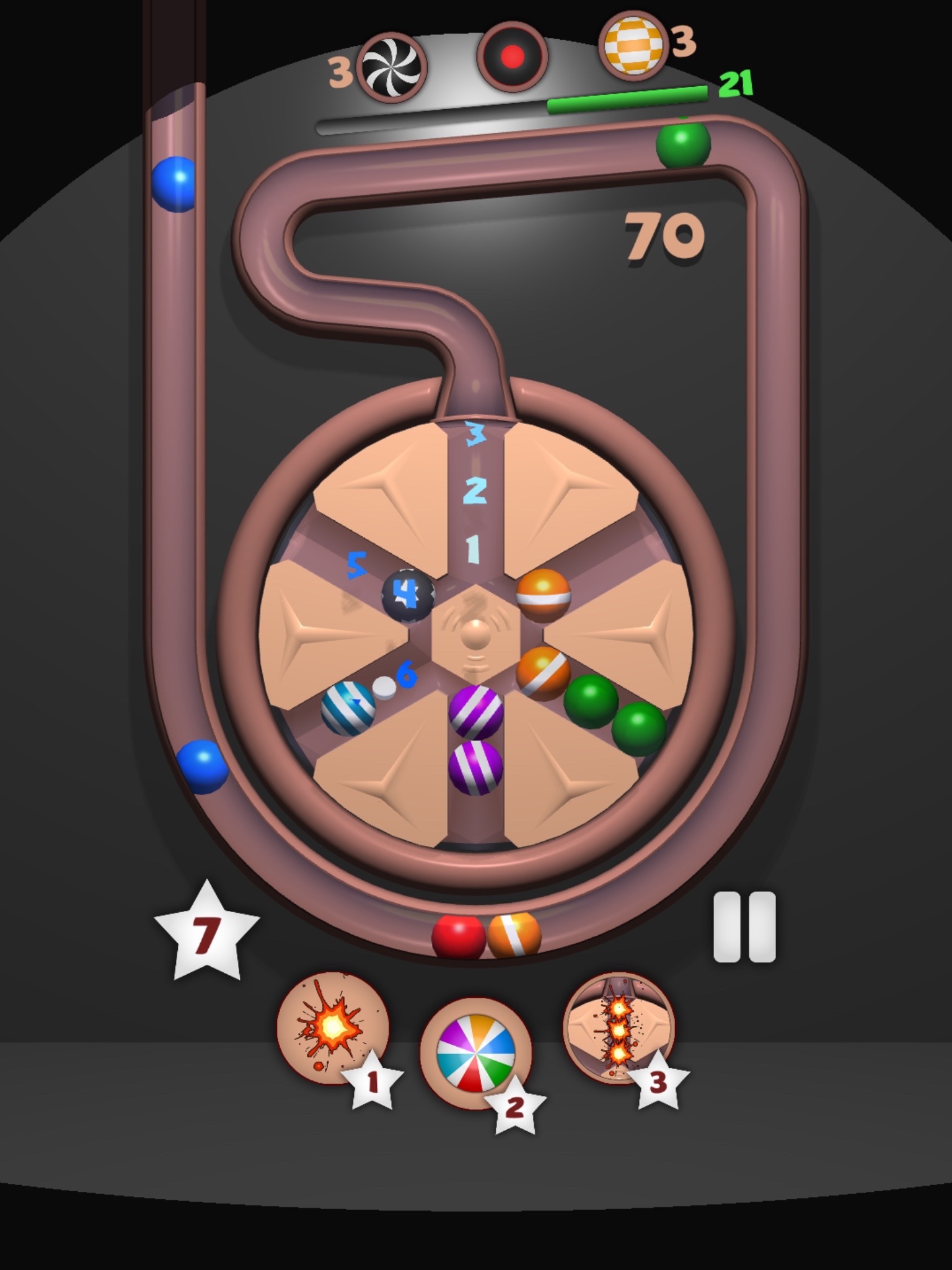 Spinis is the unique puzzle game. Spin the wheel and group same-colored balls. Third same-colored ball will remove all same-colored balls in that slot and neighborhood slots. More balls will be removed more higher value balls will apear and more points will be added to your score. If you stuck you can use bonus buttons to remove coming ball, convert coming ball in to all-colored ball and free up one slot if you need additional space. It will cost you stars. Every game begins by transferring 10 stars from your bank to the game. Additional stars you will earn in the game. Remove 50 balls and get one of powerful balls. Beginning is easy - continuing hard or not. Find it yourself.