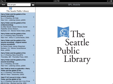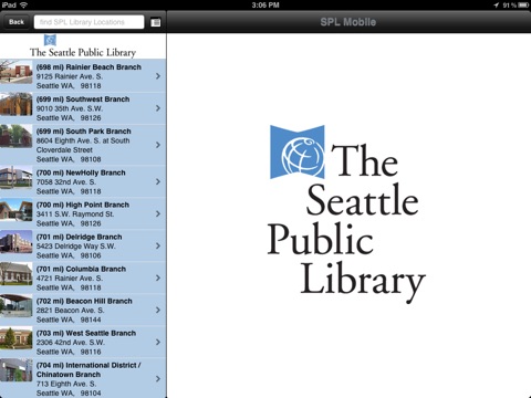 The Seattle Public Library in your pocket! The catalog, My Account, and some features of the Library Web site are now available from your Web-enabled phone. Search the Library catalog for a title, place holds, renew items you have checked out, see what you have on hold, and view most account information. You can Ask a Librarian a question via instant messaging, text, or telephone during Library open hours (phone feature dependent). Check the calendar of events for classes, story times, author readings, and other programs. Find your nearest Library location on the map and view hours, addresses, and other information. Use book, DVD, CD and audio book lists to discover new or recommended titles. Read the latest entries on Library blogs and our Facebook fan page.