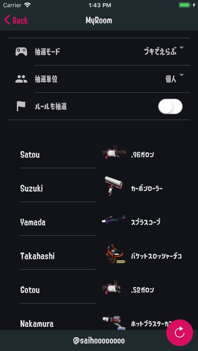 右下の抽選ボタンをタップすることで使用するブキをランダムに抽選することができます。
