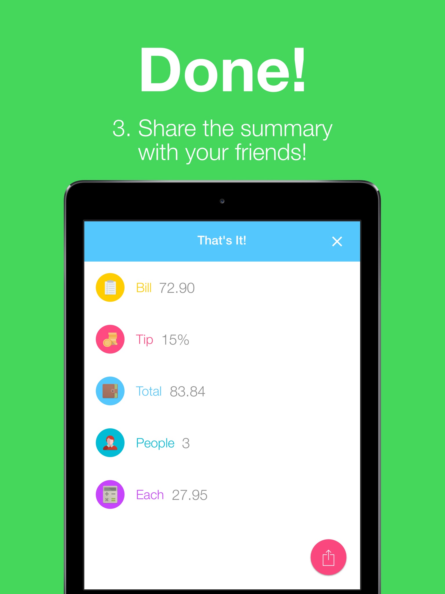 Easily calculate tips, split bills and send reminders to your friends!
