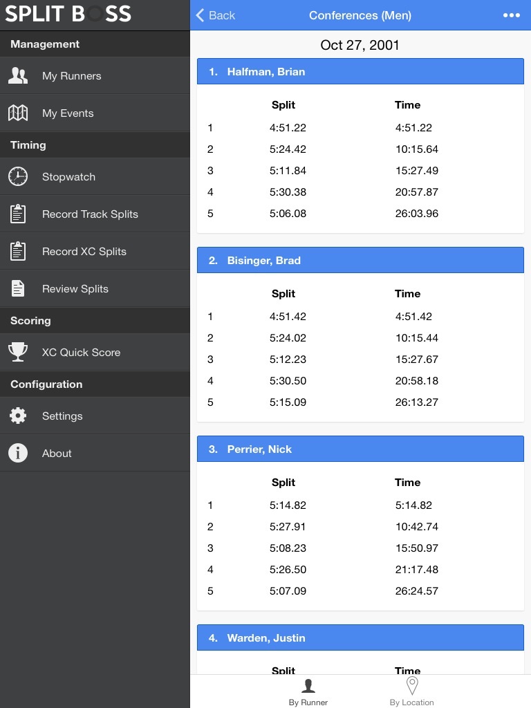When reviewing splits you simply tap a button to reorganize the data to view by runner or by lap/location. Want to send the results to yourself or a friend? No problem! Split Boss will email your splits and quick-scores to as many people as youd like.