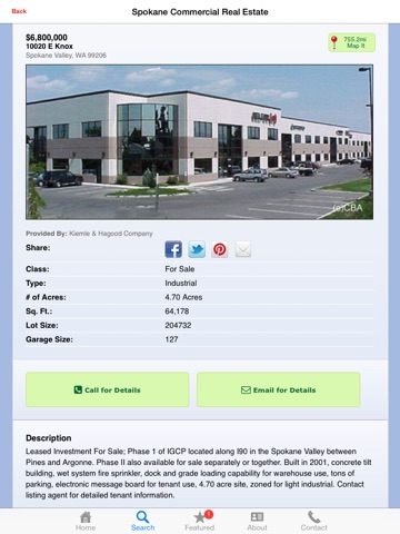 Spokane Commercial Real Estate is the Easiest Smart Phone APP to use if you are selling or buying commercial real estate. Investors select filers to cut through listings for their specific wants and needs. Spokane Commercial Real Estate delivers a Click to Property type, price, area and more, then hit SEARCH and BAM - Preview your selection in seconds. Color photos, maps, property details and broker access is a snap. Washington State, Idaho, Alaska and Oregon properties are available. Our broker associates can help with Investment Analysis, Development Analysis, Lease Analysis, Financing, Buy vs Lease, Hold vs Sell, Comparative Scenarios and Detailed Reporting.