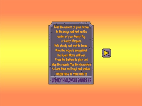 Did you receive the "Spooky " Candy Bag and/or Candies on Halloween Night? Then hurry up and download this free app to see Spooky Characters come to life right in front of your very eyes ! Do not be surprised to hear the spooky sounds they prepared for you. You can trick the treaters, your friends and whomever you want to.