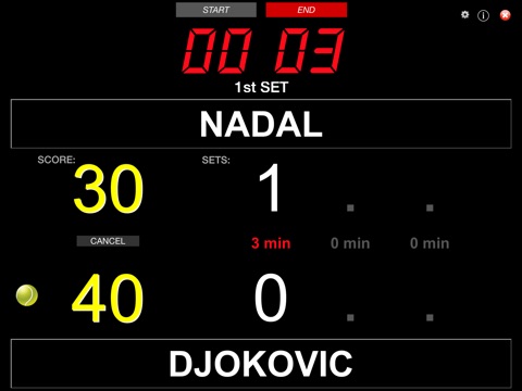 Count the point by pushing the score of the relevant player. You can cancel a point by pushing the cancel button. The duration of each set played is displayed. The match can be set to have 2 or 3 winnings sets and 5 or 6 winning games per set. Tie breaks are managed. The serving player has a yellow ball in from of his score.