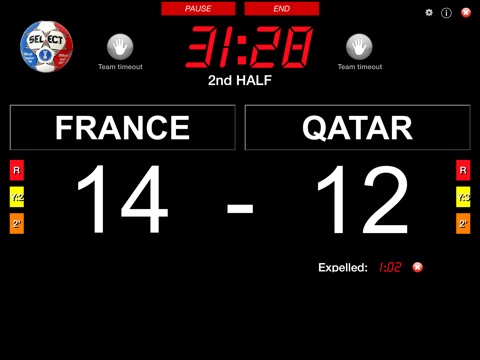 Push the score of the team which has juste scored. The duration of the 2 periods can be set from 5 to 30 minutes (5 minutes steps). Team breaks of 60 seconds are managed. 2 minutes player exclusions also managed. The number of yellow card and red cards is displayed.