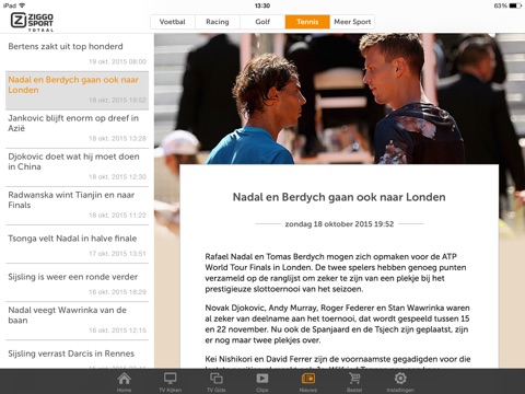 Kijk onder meer live naar de Spaanse La Liga, UEFA Champions League, Italiaanse Serie A en Franse Ligue 1. Ook al het MotoGP-spektakel, toptennis, golf en de beste Nederlandse sporten zoals handbal, volleybal, hockey en basketbal zijn te zien, evenals de mooiste documentaires. En geniet natuurlijk ook van onze spraakmakende talkshows als Rondo en het Ziggo Sport Race Café.