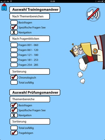 Die App enthält einen Trainings- und einen Prüfungsmodus. Im Trainingsmodus wird der gesamte Fragenkatalog der Sportbootprüfung See oder aber auch nur Teile chronologisch oder zufällig abgefragt - wie ihr das wollt.