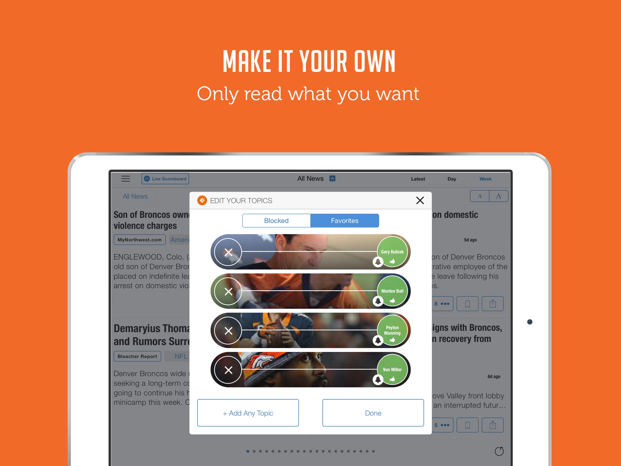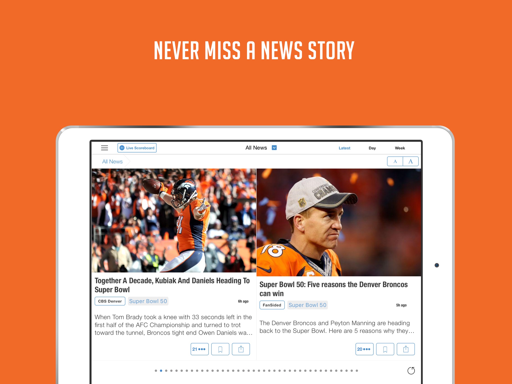 * A news summary covering stories about the Broncos from all sources- a clean feed with no repeat stories. See all sources that covered any story with a simple tap