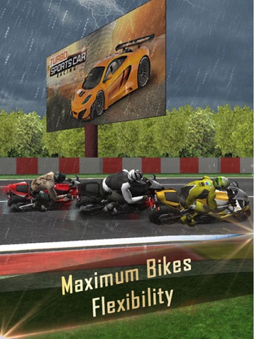 Sports Bike Racing is distinguished from other bike racing games simulators by a faithful reproduction of tactical maneuvers of bike driving on detailed tracks and most intense bike control, easy to get into, and the controls can be managed by even the very young, than when compared to other bike racing games.