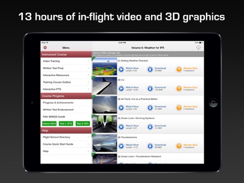 With Sporty’s Complete Instrument Rating Course, you’ll ace your FAA written test—we guarantee it! But this app is much more than just test prep. With incredible in-flight footage and 3D animations, we unlock the secrets of the IFR system so you can be a safe, smooth and proficient pilot. Detailed video segments cover both glass cockpits and analog gauges.