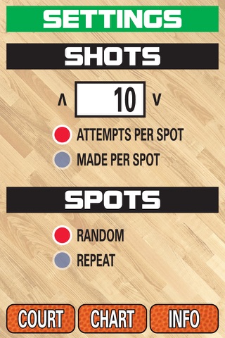 > Choose between "attempts per spot" or "made per spot" for your shooting session