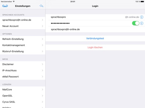 Zur Nutzung unterschiedlicher Ansagetexte für die Sprachbox müssen die entsprechenden Rufnummern als Inclusivnummern (mit eigener eMailadresse und Passwort) angemeldet werden. Zur Abfrage der jeweiligen Sprachbox müsste bei der Telekom- Sprachbox pro auch jeweils eine neue Anmeldung mit dem entsprechenden Passwort erfolgen. Dies ist natürlich extrem umständlich. Mit der vorliegenden App können sämtliche Rufnummern einmalig angemeldet werden und sämtliche Sprachbox- Mitteilungen können bequem abgefragt werden. Sehr nützliche App, gut programmiert!