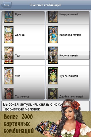 - 13 категорий значений карт Таро как для прямых, так и для перевернутых: любовь, здоровье, результат, работа и т. п.