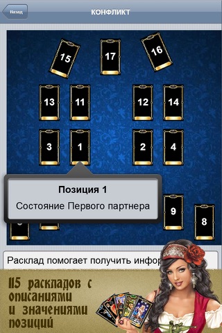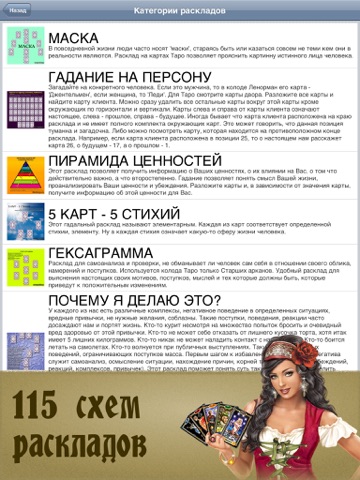 - Более 115 интерактивных схем популярных карточных раскладов с подробными описаниями.