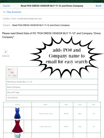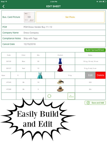 -Simply add codes, colors, qtys of products you want to sell/buy, take a picture, click build and the APP will build spreadsheet of all items in excel format and email you or your customer/vendor the order in excel spreadsheet format.