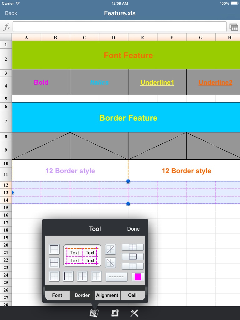 ● Cell formatting, including bold,underline, italic, borders, text and cell color, alignment, text wrapping and so on.