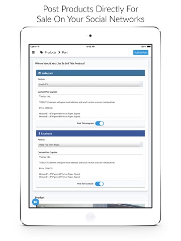 You can create a new product post in seconds using this app, and then post directly to your social networks.