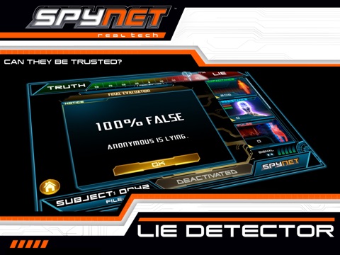 Welcome secret agents to Spy Net Lie Detector. This App is for use in the field to better help you determine fact from fiction on any mission.