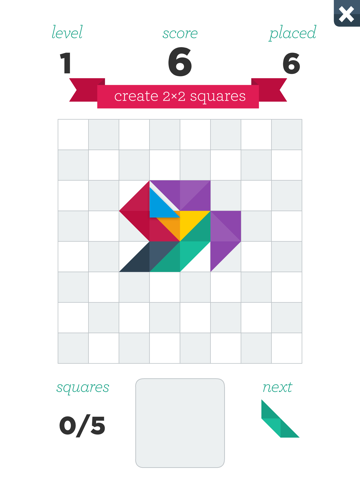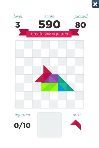 Create 2x2 squares on the board by placing all the different figures and shapes exactly right.