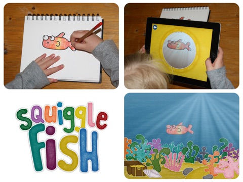 First, grab a sheet of white paper and a thick black pen and draw a fish. Then color it in however you like! When you’re happy with your fish, swipe down, and hold the iPad over your drawing. Watch as it magically comes to life! SquiggleFish is a unique experience for your child which encourages their imagination and creativity. Encourage them to create fish of all shapes and sizes. Make them colorful, use different materials and watch in wonder at the results . It’s perfect for children aged 3-7, and ideal for collaborating in groups. Each child can draw a fish and add it to a beautiful shared underwater world. To achieve the best results follow these simple tips: - Use a thick black felt pen. - Draw your fish with a complete, unbroken outline. No gaps! - Color your fish in. - Use plain white paper and leave plenty of space around your fish. - Make sure you have plenty of light and there are no shadows over your paper. - Hold the iPad very still. If your fish is being silly and swimming backwards, tap it and click on the button on the bottom left. The button on the bottom right can be used to delete a fish.