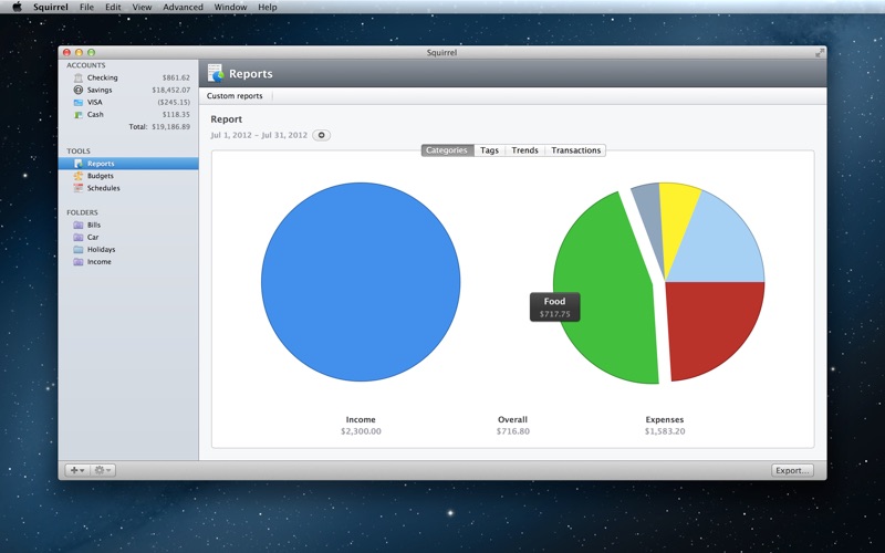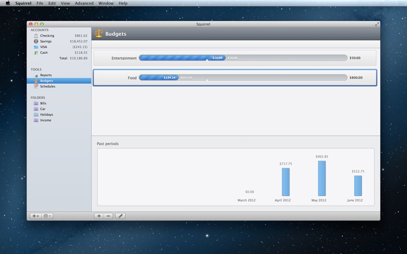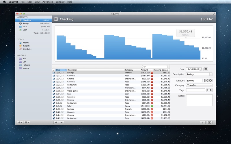 I have been using Squirrel for 2 years. I had become dissatisfied with an old version of Quicken for Mac. There certainly were (and are) many simple low cost (even free) financial apps for Mac. I downloaded and tried most of the significant ones available at that time and since then. My bank was just getting into on-line banking and Squirrel was the one that worked immediately “out-of-the-box”. The interface was good, the support was there (whenever I emailed a reply was quickly received), the price was reasonable and Squirrel did its job well. Its development has been slow and steady, not making any grandiose claims. I don’t have heavy duty financial needs and recommend it from that point of view. Thanks to the developer for his work and a good product. RJSmac30