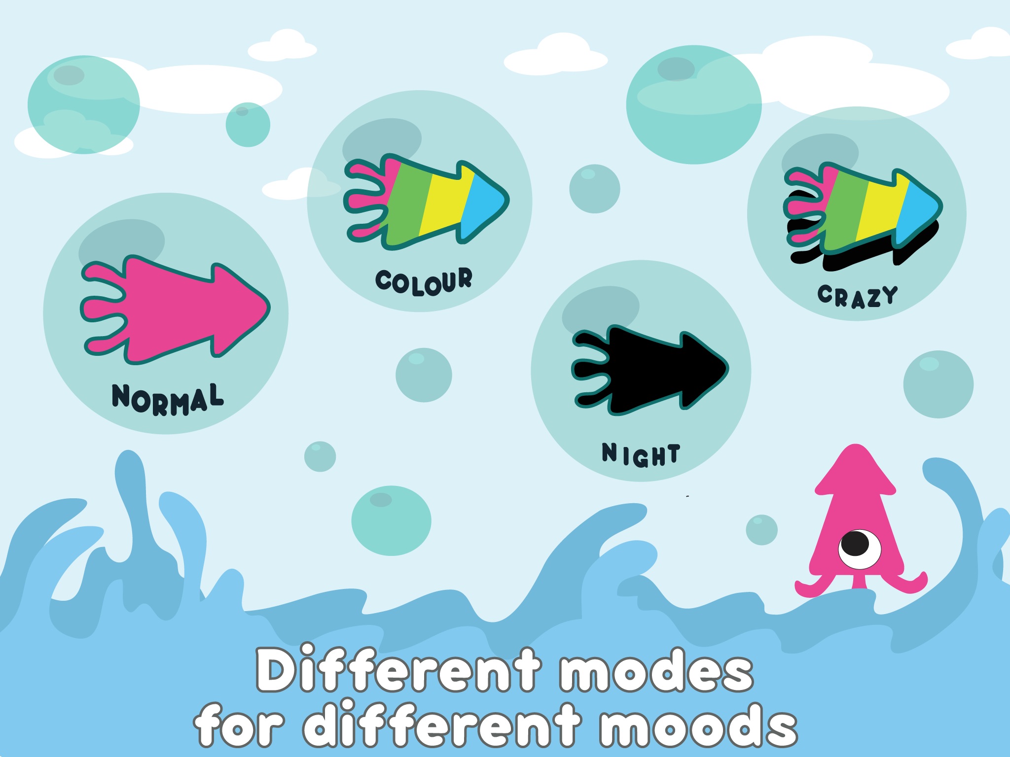 Try the color blind mode where the level will blind you from seeing the squid. Experience night mode where the squids are your only source of light. Test your limits in crazy mode where both color and night mode happens at the same time